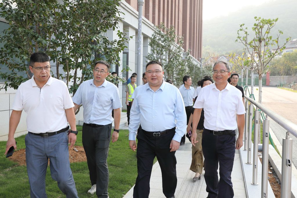 在新農科教育教學中心建設工程項目現場,朱斌一行聽取了項目進展和驗收工作安排匯報,實地查看了各學院樓、交叉中心、本科教學中心等各幢建筑的內部裝飾、設施設備和周邊配套道路、景觀綠化等建設情況,并詳細了解了驗收準備等工作。