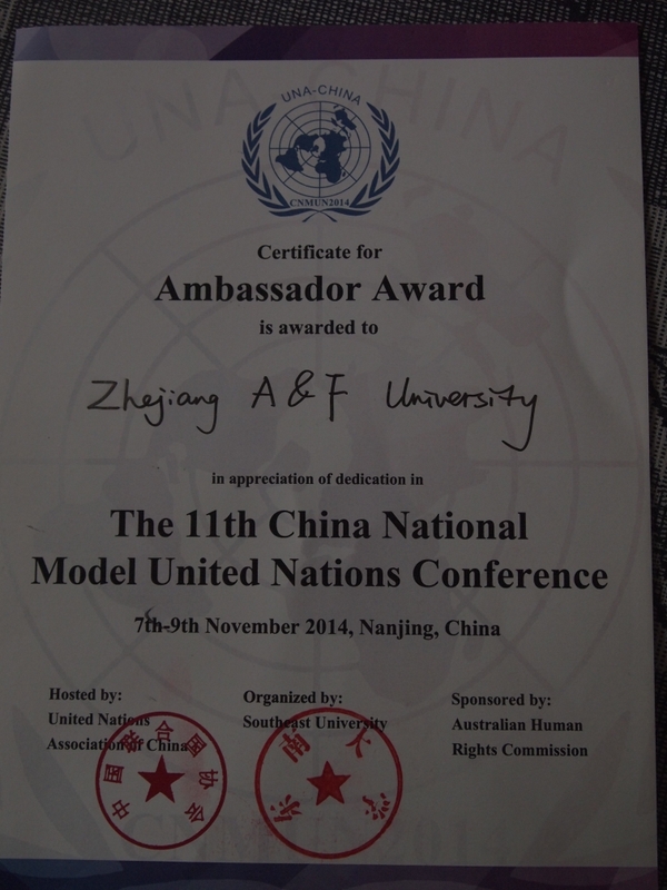近日,由法政學院法律專業2013級李銘慧、經管學院金融管理專業2014級蔡震昊組成的校模擬聯代表團,在法政學院法律系馬永雙教授、趙瑾老師的指導下,在第十一屆中國模擬聯合國大會中表現優異,從參會的120多所海內外高校,300多名學生代表中脫穎而出,摘得浙江地區參會院校中唯一的獎項——“大使獎”,創造了我校校模聯自2008年成立以來的最好參會成績。