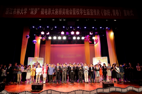 浙農林大新聞網訊 5月10日晚,浙江農林大學“筑夢”微電影大賽頒獎晚會暨校學生版宣傳片《你好,青春》首映式在東湖影劇院舉行。副校長兼集賢學院院長張立欽,校黨委委員、宣傳部部長陳永富,學工部部長繆魯加、圖書館館長徐光輝、集賢學院常務副院長林夏珍,以及學校相關部門、學院的領導和老師出席了此次活動。大賽以“筑夢”為主題,由集賢學院與校學生通訊社聯合主辦,集賢學院團總支、學生會承辦,被譽為“浙農林奧斯卡”。