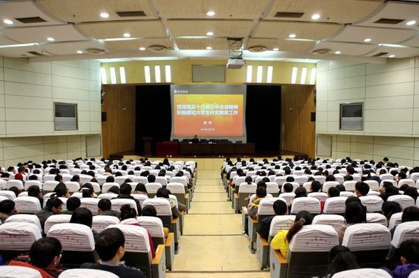 浙農林大新聞網訊 12月27日,“貫徹落實十八屆三中全會精神,積極推動大學生村官教育工作”專題報告會在圖書館第一報告廳舉行,報告會由校黨委副書記余杰主講,研工部部長童再康主持。研工部工作人員、研究生輔導員和在校研究生到場聆聽報告。