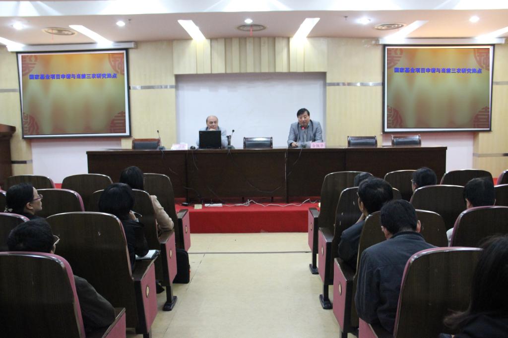 黃祖輝教授結合自己的申報經驗和體會作了題為“國家社科基金申報與‘三農’研究熱點”的輔導報告。他從專家評審標準、課題選題、國內外研究現狀、研究意義、研究內容、研究思路、研究方法、團隊組合、前期成果以及申報書撰寫技巧等多個方面對如何申報國家社科基金做了全面詳實的解讀,并解讀了當前“三農”研究熱點。
