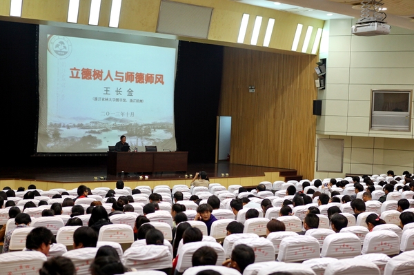 王長金從“立德樹人”本意講起,指出“立德”為古代學者所倡導的“立德”、“立功”、“立言”三立之首,在中國傳統文化中是不朽的追求、事業之基、立身之本。強調“樹人”須先立師德,首先,樹立“不知為不知”的嚴謹治學態度、“敏以求之”的求實態度、“韋編三絕”的刻苦精神、“不恥下問”的好學品格;其次,崇尚“以身示教”的人格風范、“身正為范”的人格魅力、“因材施教”的教育理念;第三,提倡“清貧樂道”的敬業精神,對學生要有“有教無類”的公平精神,追求“憂道不憂貧”的人生哲學;最后,擁有“如琢如磨”的人文情懷。師生之間要建立“無隱無私”的民主作風、情同父子的師生關系,擔負起教書育人的神圣使命。