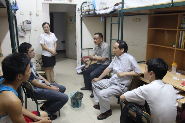周國模還走訪了A6A7學(xué)生公寓的兩間寢室,詢問同學(xué)們學(xué)習(xí)生活情況、了解學(xué)生留校原因,和藹可親的態(tài)度讓同學(xué)們倍感溫暖。交流中了解到同學(xué)們?yōu)榱擞峦頃I(yè)實習(xí)等不同原因延遲了回家的時間,周國模囑咐道:“暑假在學(xué)校一定要注意安全”。