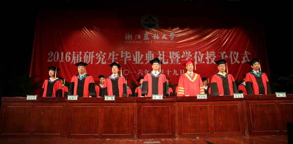 6月19日,浙江農林大學2016屆研究生畢業典禮暨學位授予儀式在東湖校區活動中心影劇院隆重舉行。校黨委書記宣勇、校長周國模、校黨委副書記方偉、副校長金佩華、紀委書記鐘平、副校長沈月琴出席畢業典禮。典禮由校黨委副書記史永安主持。