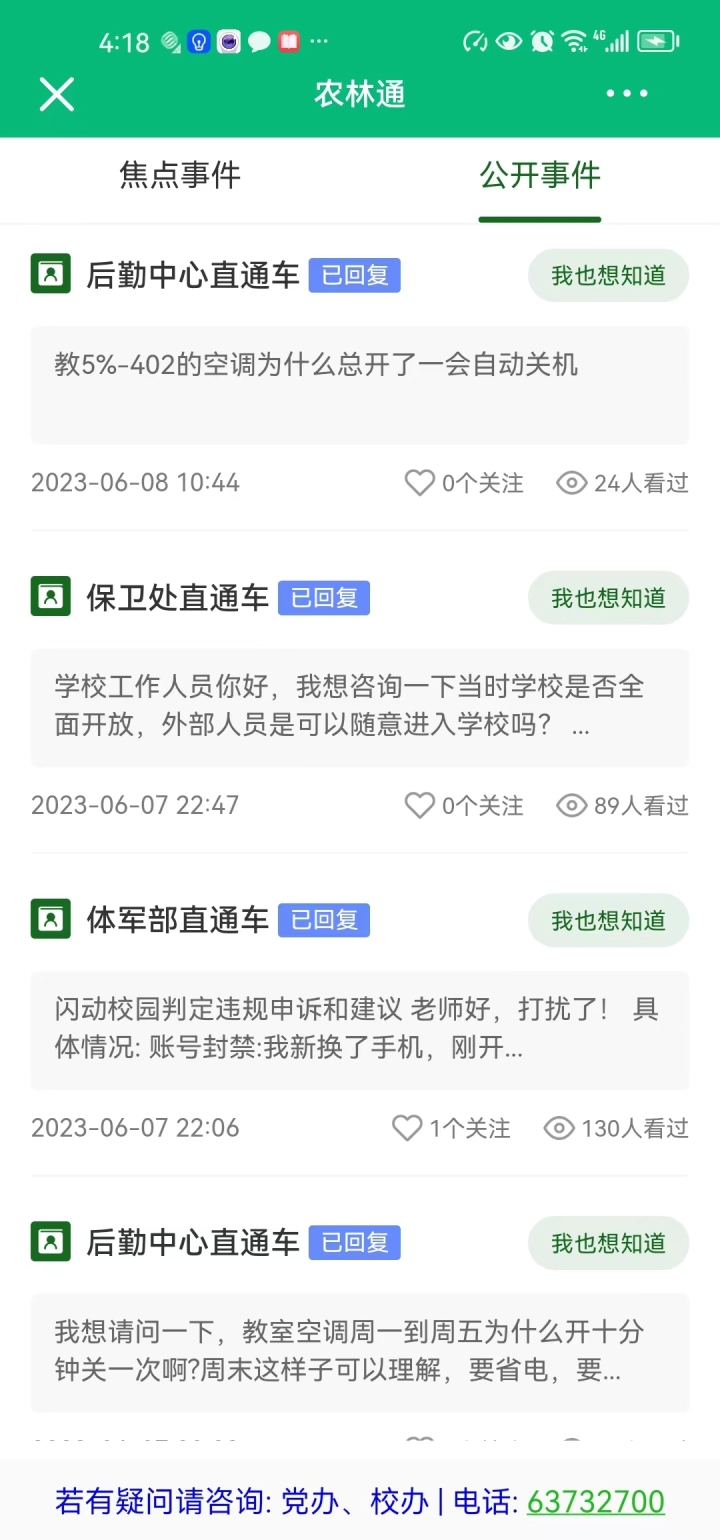 提問題的師生還可以根據(jù)相關(guān)部門的解決或者回復(fù)情況,對(duì)服務(wù)態(tài)度、解決問題的質(zhì)量效果等進(jìn)行打分。“農(nóng)林通”自2022年3月開通運(yùn)行以來,共受理辦結(jié)師生反饋事件6450余件,3天內(nèi)事件辦結(jié)率99.8%,滿意度保持95%以上。