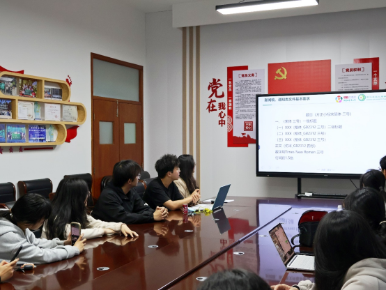 第二個環節,學生會執行主席朱雨潔對學生會近期工作進行部署,對學生會工作人員的業務能力進行培訓。主要從辦公軟件使用、辦文辦會注意事項、社會實踐落實要點、通訊新聞稿撰寫、公眾號排版技巧等方面進行培訓。