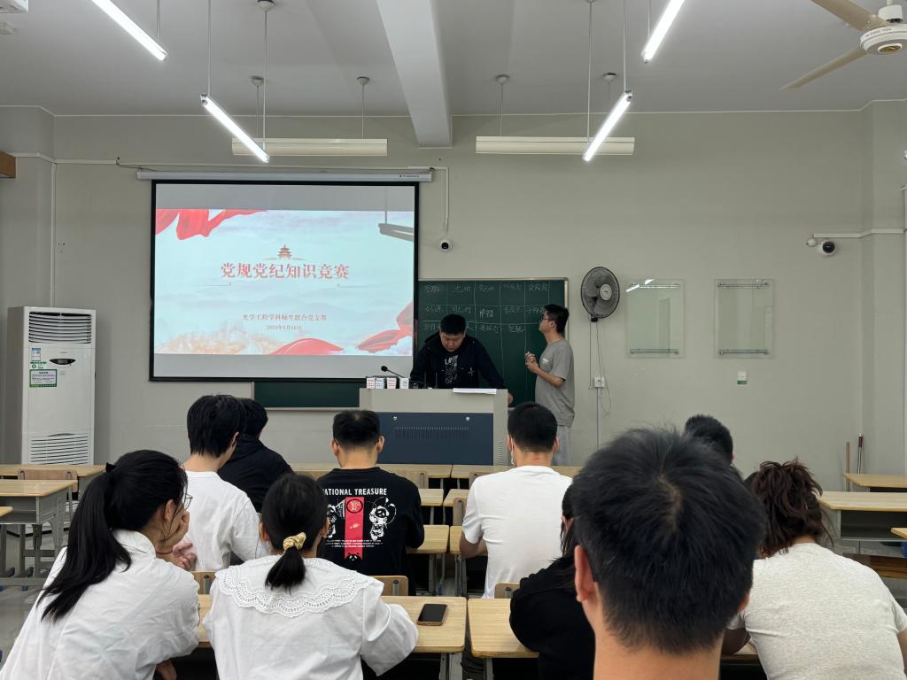 5月16日下午,光學工程學科師生聯合黨支部于學14-308教室開展“學黨紀、明黨規、強黨性”為主題的黨規黨紀知識競賽活動。活動由支部組織委員時寶龍和宣傳委員楊景楠主持。
