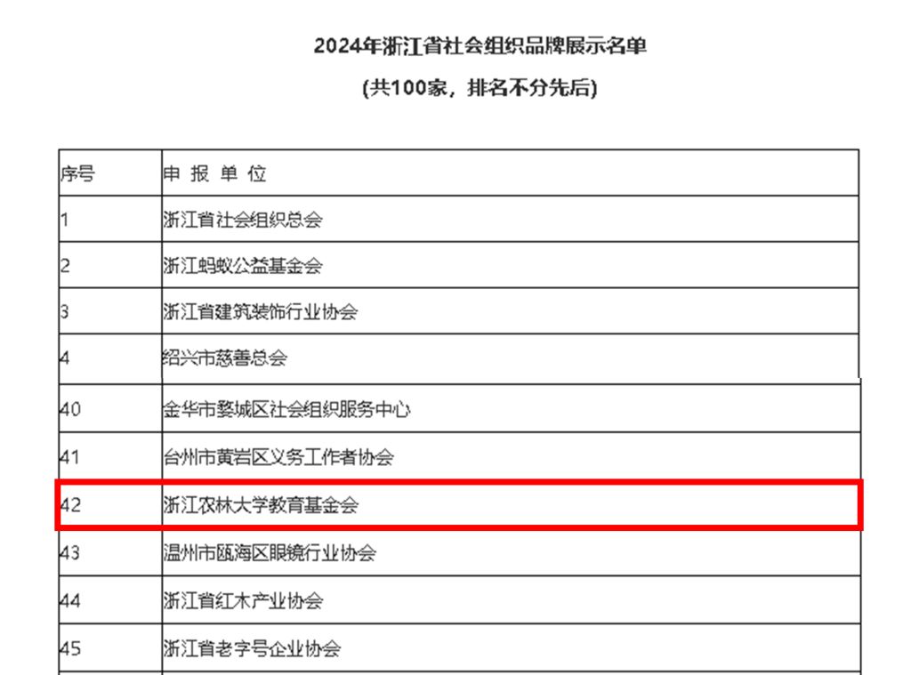10月18日,浙江省民政廳公布了2024年全省社會組織品牌展示和領(lǐng)軍人物評價結(jié)果,浙江農(nóng)林大學(xué)教育基金會獲評“浙江省品牌社會組織”稱號,系全省唯一一家獲此殊榮的高校教育基金會。