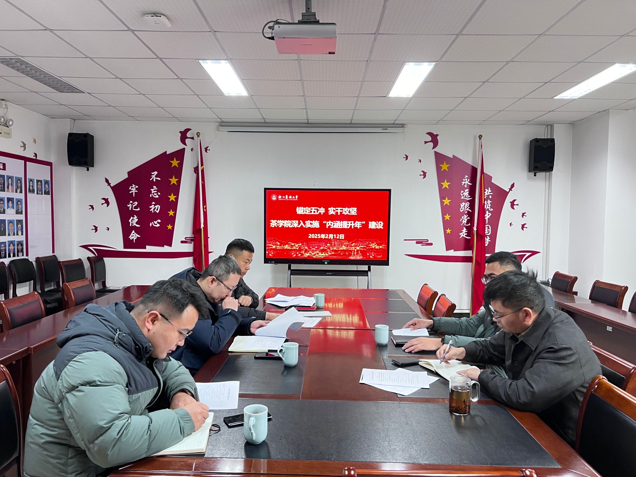 2月12日,茶學(xué)院召開“內(nèi)涵提升年”建設(shè)專題推進(jìn)會(huì),圍繞“內(nèi)涵提升年”專項(xiàng)行動(dòng)主題,系統(tǒng)部署改革發(fā)展任務(wù)。茶學(xué)院院長(zhǎng)董杜斌主持會(huì)議。