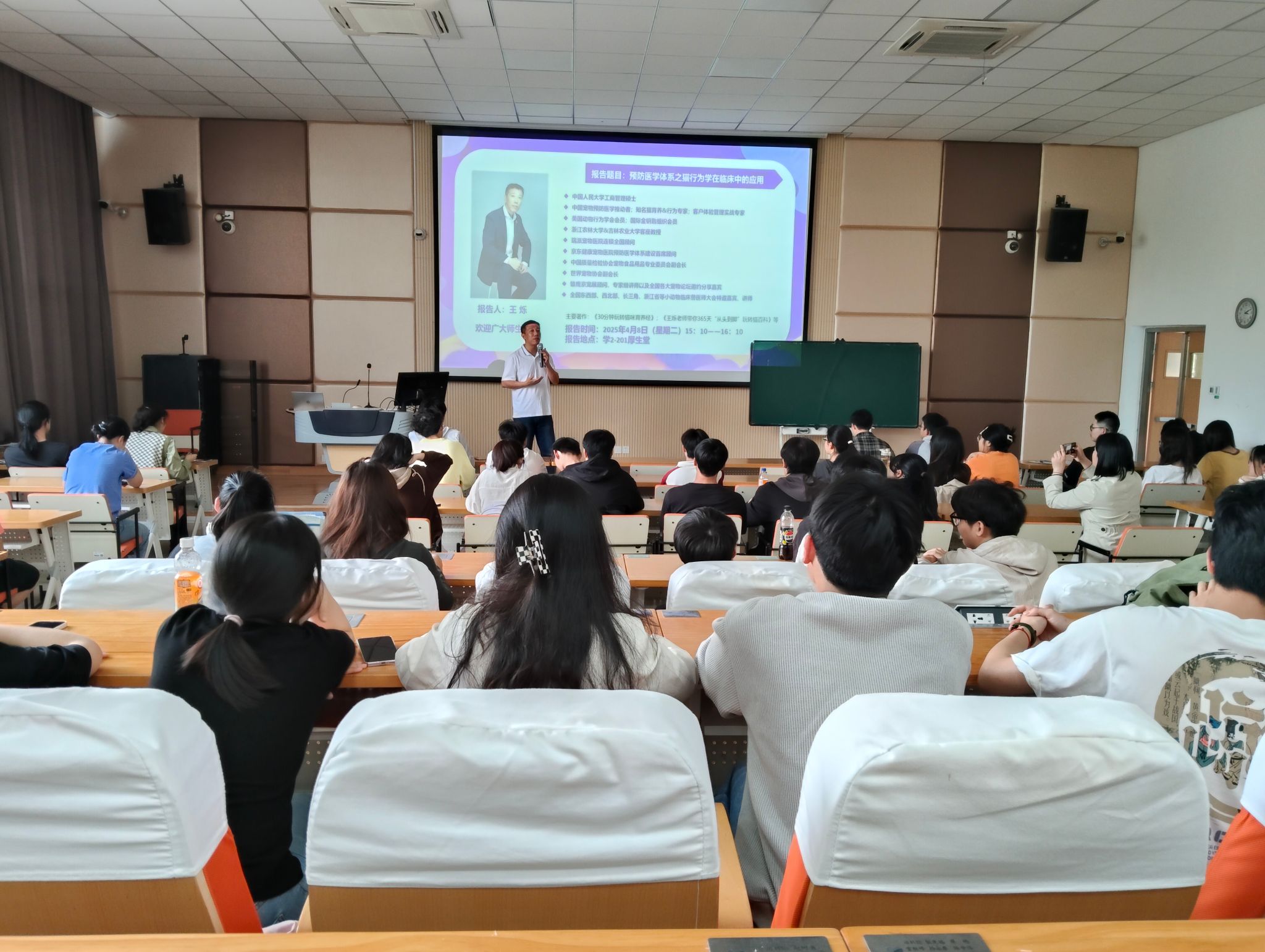 4月8日下午,中國質量檢驗協會寵物食品用品專業委員會副會長王爍應邀來動科動醫學院進行學術交流,為學院師生作題為“預防醫學體系之貓行為學在臨床中的應用”的學術報告。校黨委委員、動科動醫學院院長宋厚輝,動科動醫學院黨委書記魏玲玲及師生代表100余人參加活動。