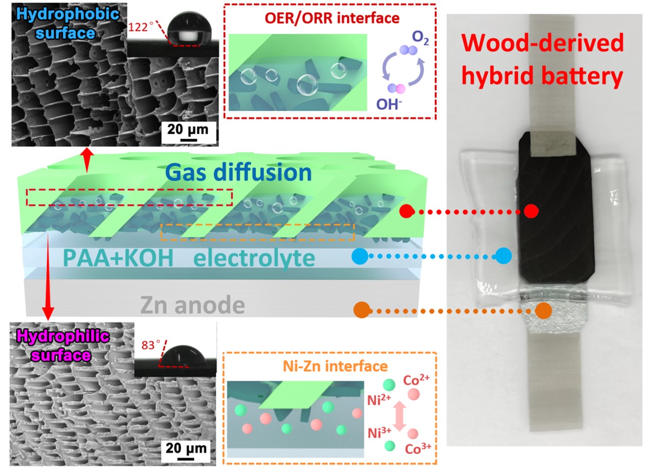 隨著新能源產業的快速發展,市場對于新型高性能可充電二次電池的需求日益增長。混合鋅電池結合了堿性鎳鋅電池和鋅空氣電池兩者的優點,在二次電池儲能領域引起了廣泛關注。然而,電催化氧反應的動力學和電解液的傳質受到不匹配和無序的多相反應界面傳遞通道的限制,極大地阻礙了混合鋅電池的性能。在這項研究中,開發了源自松木天然結構的連續定向的三相界面通道正極,以應對這些挑戰。將松木片碳化,然后僅在木材衍生碳片的一側電沉積生長活性材料,即可制作集成活性材料、集電器和連續定向三相反應界面通道于一體的木材衍生正極。該連續定向的三相反應界面通道可實現導電骨架內的電解液高效滲透和快速氧擴散,從而加速反應動力學。因此,基于木材衍生正極的準固態混合鋅電池執行了超出鎳鋅電池的額外充放電過程,具有寬工作電壓(0.6-2.0 V)、高比容量(在1 mA/cm2時達到656.5 mAh/g)、出色能量密度(644.7 Wh/kg)以及良好耐久性(連續工作8000分鐘后的容量保持率為80.0%)等優勢。與單純的鎳鋅電池相比,混合鋅電池的容量提升幅度高達約370%。這使得所制作的混合鋅電池在堿性鋅電池領域中處于領先地位,并且展現出作為低成本、高性能、長壽命、環保和低碳足跡儲能裝置的卓越潛力。