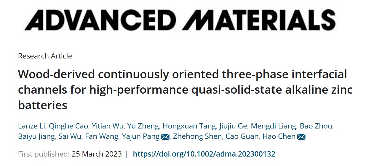3月25日,化材學院林業工程學科生物質微納米功能材料研究團隊在材料科學領域國際頂尖期刊《Advanced Materials》(中科院1區Top,IF=32.086)在線發表題為“Wood-derived continuously oriented three-phase interfacial channels for high-performance quasi-solid-state alkaline zinc batteries”(木材衍生連續定向三相界面通道用于高性能準固態堿性鋅電池)的研究論文。第一作者是該團隊碩士研究生李嵐澤,通訊作者為陳浩教授和青年教師龐亞俊博士。浙江農林大學化學與材料工程學院為第一單位和唯一通訊單位。