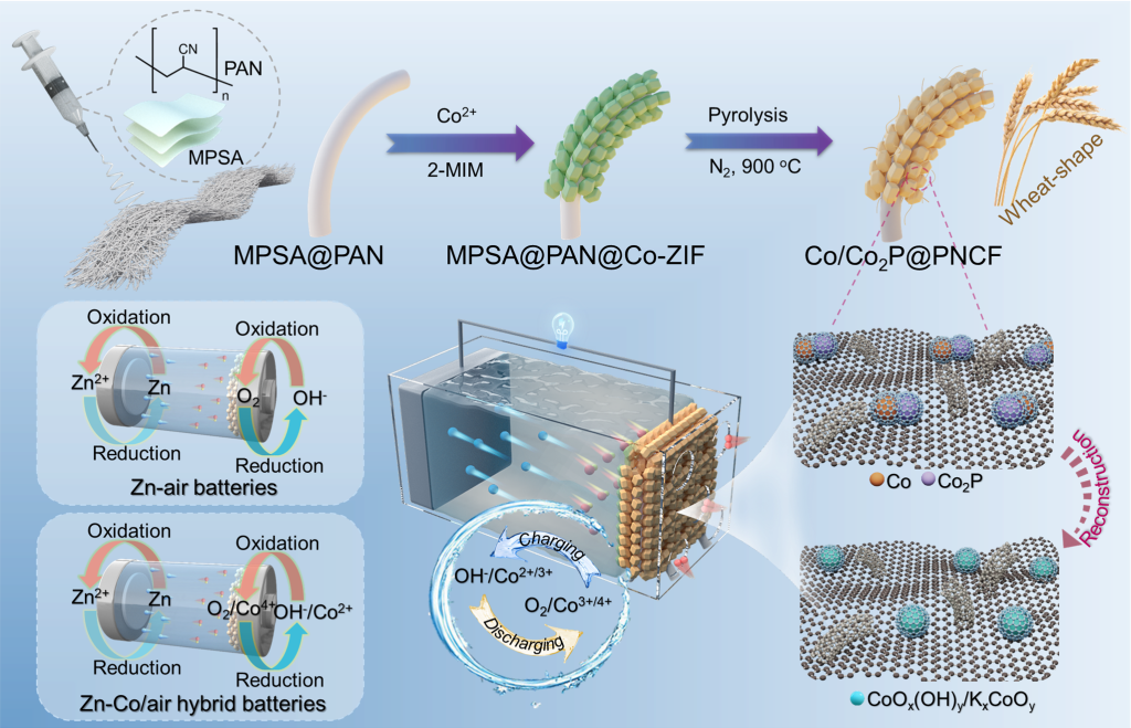 近日,化材學院胡勇教授、顏磊講師在國際頂尖期刊《Advanced Energy Materials》(中科院1區Top,IF=24.4)在線發表題為《自重構Co/Co2P異質結構提高堿性Zn-Co/air雜化電池的效率和耐久性》(Enhancing Efficiency and Durability of Alkaline Zn-Co/Air Hybrid Batteries with Self-Reconstructed Co/Co2P Heterojunctions)的研究論文。該工作成功合成了一種類似小麥狀的Co/Co2P@PNCF材料,并首次將其作為可充電Zn-Co/air雜化電池的高效自支撐陰極,實現了雜化電池優異的性能輸出。論文通訊作者為化材學院胡勇教授,共同通訊作者化材學院顏磊講師。