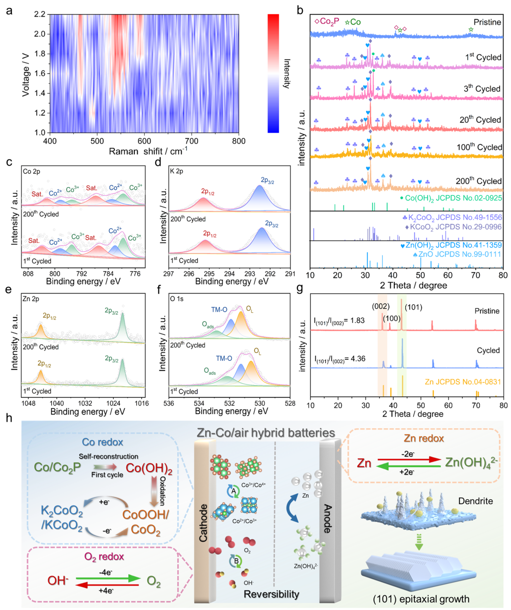 本工作制備了一種類似小麥狀的陰極材料(Co/Co2P@PNCF),該材料由P/N共摻雜碳納米纖維的“中心莖”和密集排列的Co/Co2P異質結構的“谷粒”組成。這種仿生納米結構不僅提供了大量暴露的活性位點,最大限度地提高了可及性,而且為電子轉移和O2/OH-擴散建立了高導電網絡。此外,Co/Co2P異質結構在第一個循環過程中自重構產生高價鈷活性物種,形成了高效的Co2+? Co4+氧化還原對,以提供額外的充放電電壓平臺。原位拉曼和非原位X射線衍射光譜證明了Co3+/4+Ox(OH)y? KxCo2+/3+Oy的可逆過程,提高了電池的效率和耐用性。基于Co/Co2P@PNCF的Zn-Co/air雜化電池具有出色的功率密度(321 mW cm-2)、超長的循環穩定性(700 h)和較高的能量效率(20 mA cm-2時為62%)。這項工作為開發高效穩定的多功能電催化劑以及設計高性能的新能源體系提供了新的思路與途徑。
