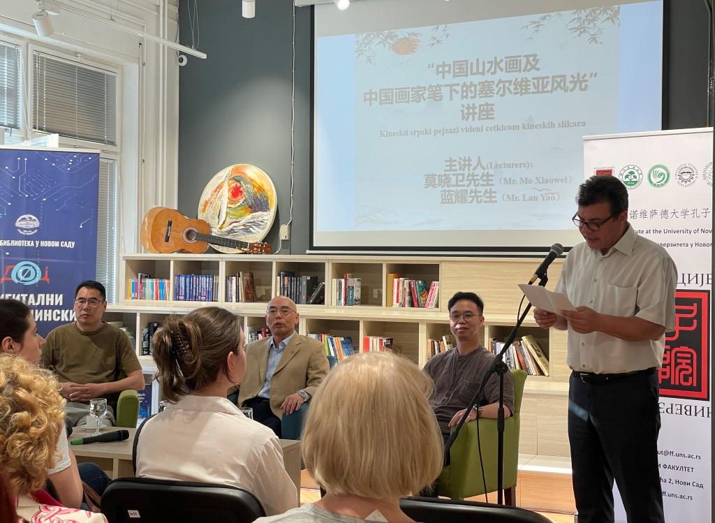 當(dāng)?shù)貢r(shí)間5月22日至26日,諾維薩德大學(xué)孔子學(xué)院在塞爾維亞森塔語(yǔ)言高中(Senta Grammar School)、諾維薩德市中心圖書館(City Library of Novi Sad)、卡爾洛夫茨語(yǔ)言高中(Karlovci Grammar School)和沙巴茨語(yǔ)言高中(Sabac Grammar School)等教學(xué)點(diǎn)舉辦了“中國(guó)山水畫及中國(guó)畫家筆下的塞爾維亞風(fēng)光畫展”系列活動(dòng)。來(lái)自浙江省中國(guó)美術(shù)家協(xié)會(huì)會(huì)員莫曉衛(wèi)、藍(lán)耀向當(dāng)?shù)貙W(xué)生和民眾講述了中國(guó)繪畫藝術(shù)及其歷史,展示了他們筆下的塞爾維亞風(fēng)光畫作,用深厚的藝術(shù)造詣和獨(dú)特的創(chuàng)作風(fēng)格,為大家?guī)?lái)了一場(chǎng)視覺(jué)盛宴,有效增進(jìn)了孔子學(xué)院師生對(duì)中國(guó)繪畫藝術(shù)及傳統(tǒng)文化的了解。
