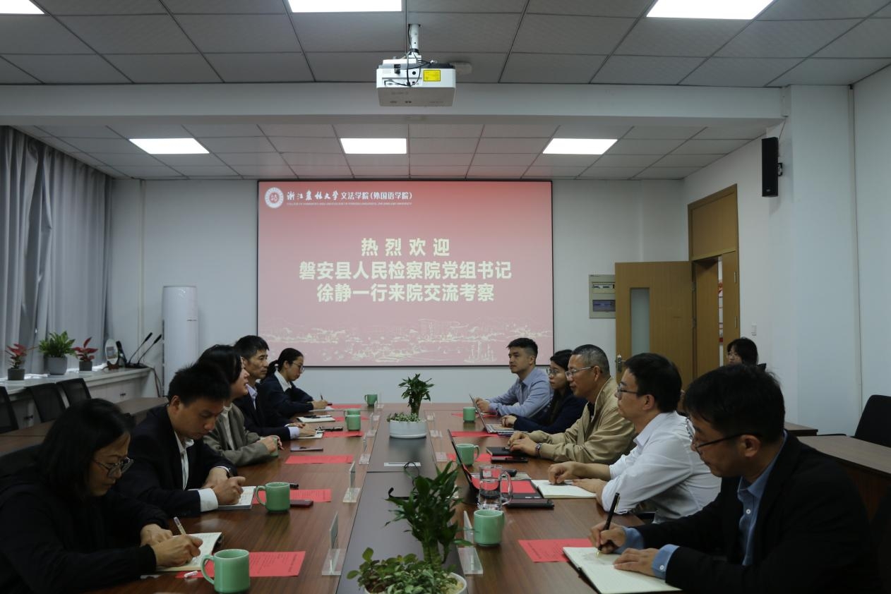 11月15日,磐安縣人民檢察院黨組書記徐靜一行來文法學院交流合作。文法學院院長魯可榮、學院相關負責人及法學學科教師代表參加交流。