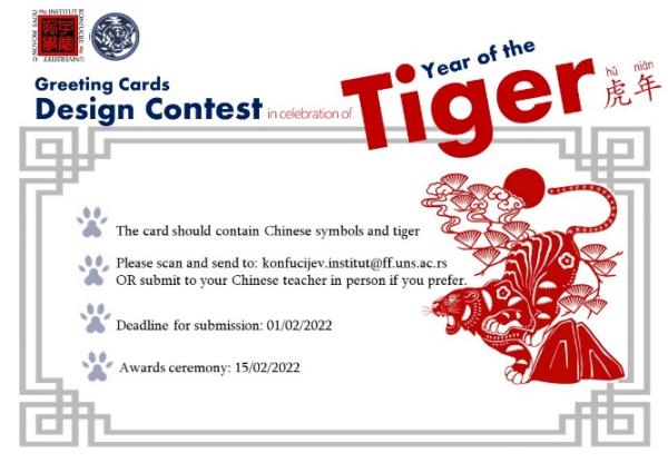 2022年虎年春節,受當地疫情影響,往年廣受歡迎的線下慶祝中國新年活動無法舉辦,為延續這一當地民眾喜聞樂見的傳統,塞爾維亞諾維薩德大學孔子學院特地舉辦了虎年春節賀卡設計大賽,得到了當地中小學、大學、孔子課堂學生和社會民眾的熱烈響應,120余人提交了參賽作品。